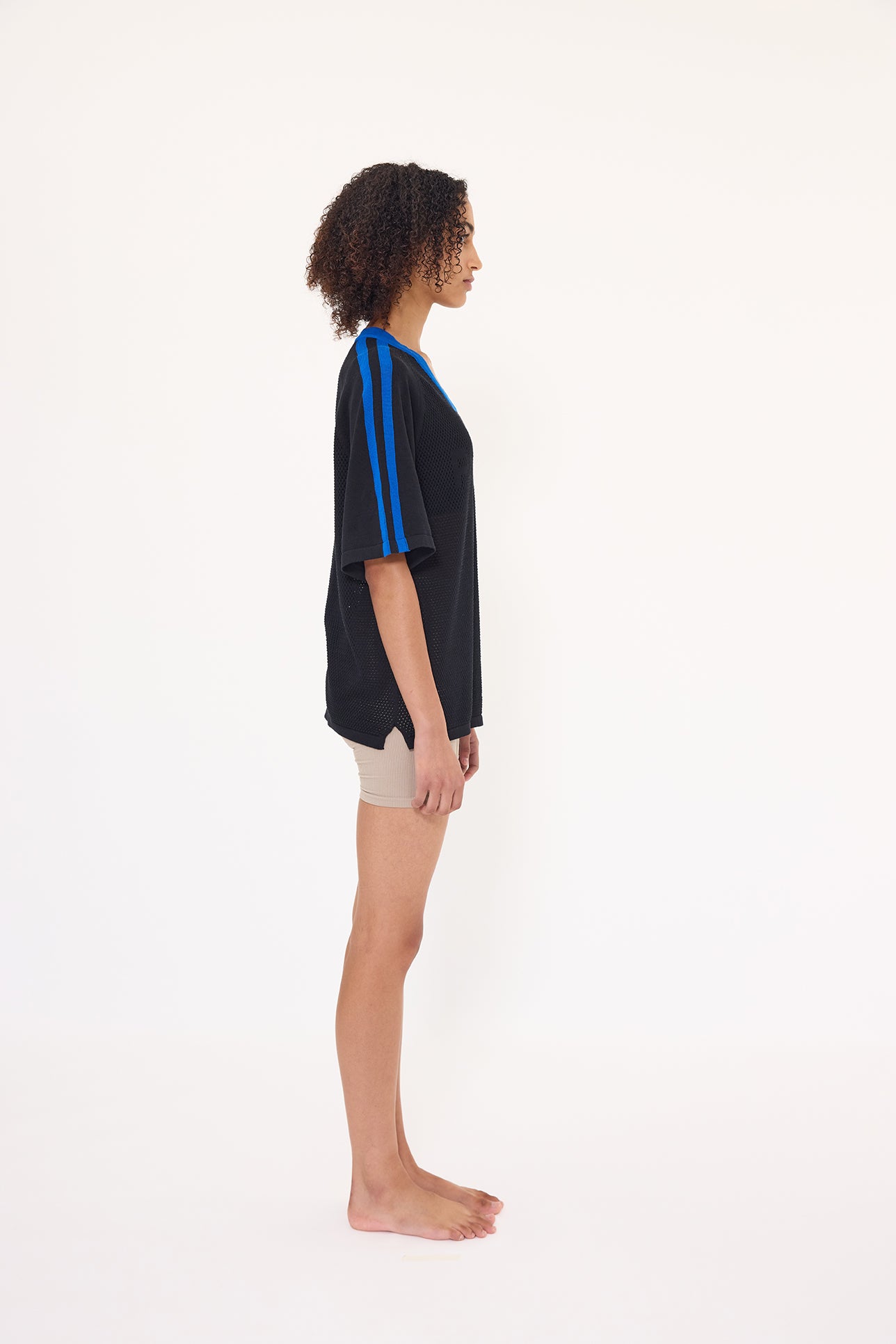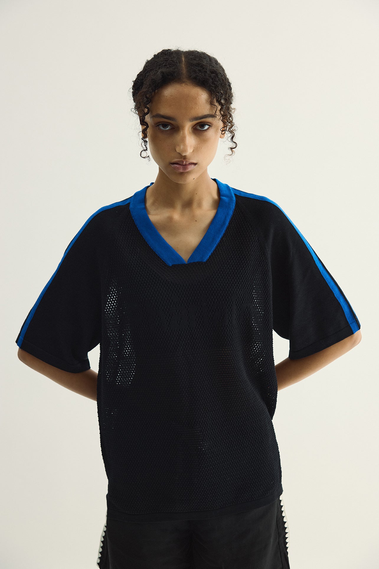 The Game Top gives a subtle nod to classic sporting style. Knitted in lightweight mercerised cotton, its body features a summer-ready eyelet stitch, while plain sleeves are finished with contrast stripes. The Phàrlain name is knitted into the front as a graphic detail.