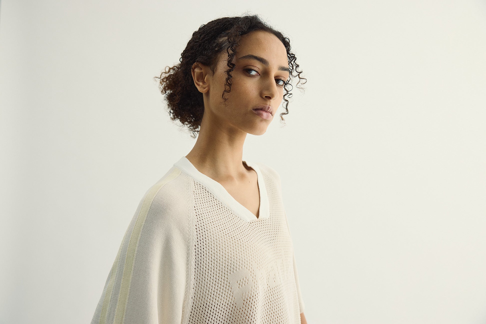 The Game Top gives a subtle nod to classic sporting style. Knitted in lightweight mercerised cotton, its body features a summer-ready eyelet stitch, while plain sleeves are finished with contrast stripes. The Phàrlain name is knitted into the front as a graphic detail.